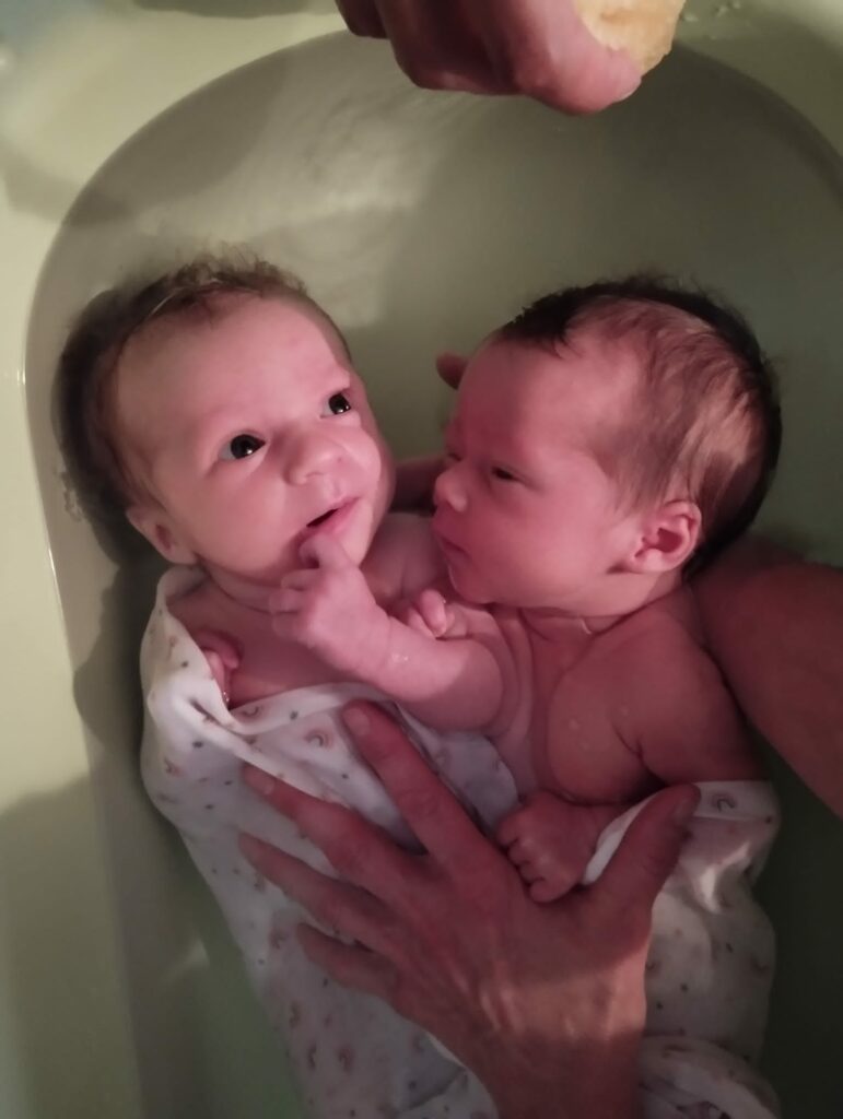Un moment de détente avec ce bain langé pour mes jumelles de 3 semaines.